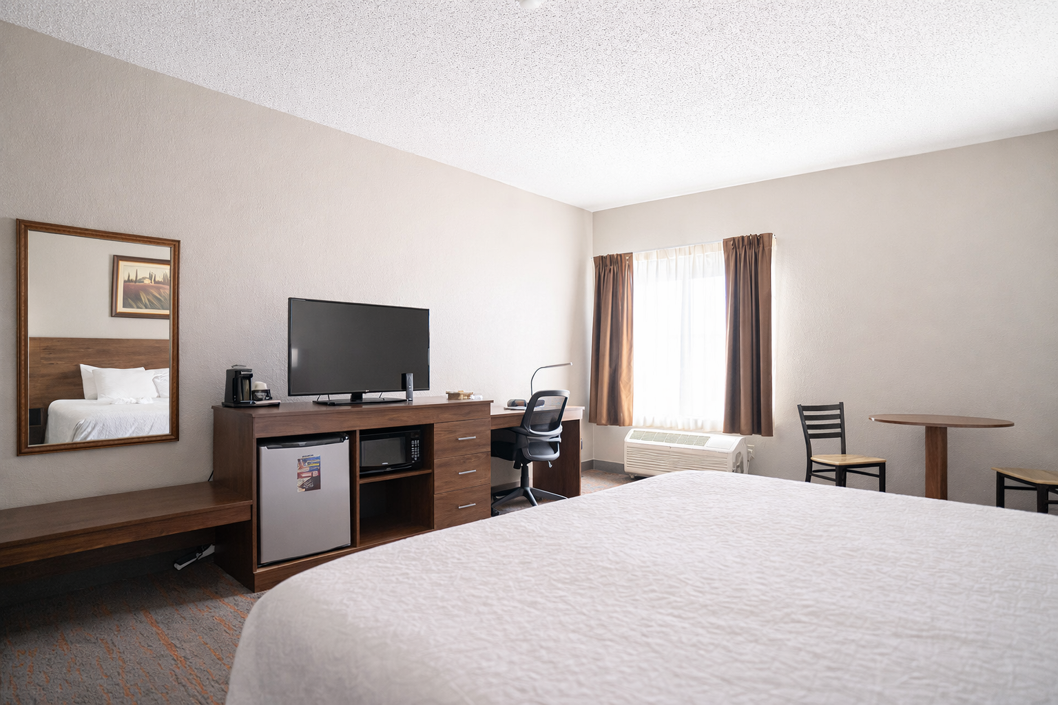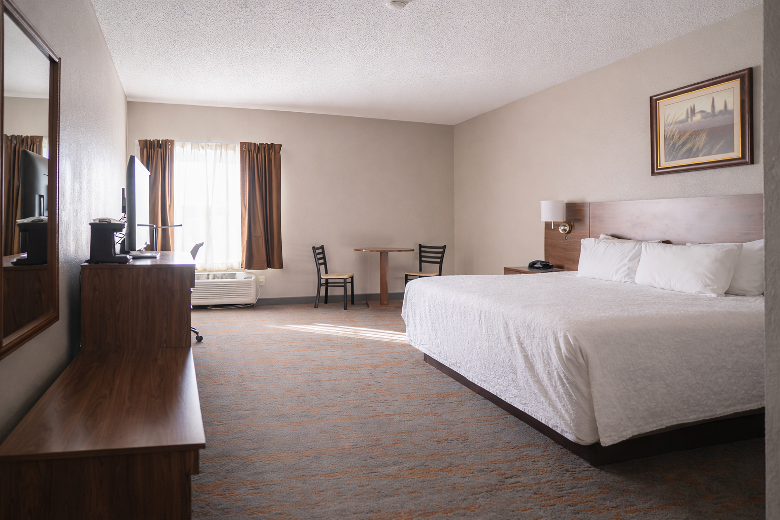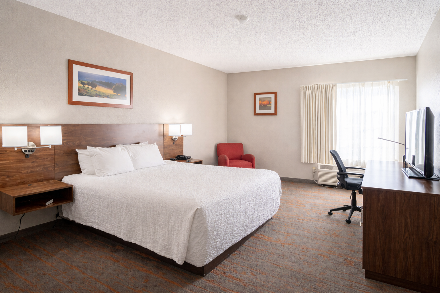 This room includes a King bed, and features free WiFi, a premium entertainment package, mini refrigerator, a spacious work desk, in-room coffee, and more. Warm and inviting, our King Rooms provide cozy comfort you’re sure to enjoy.