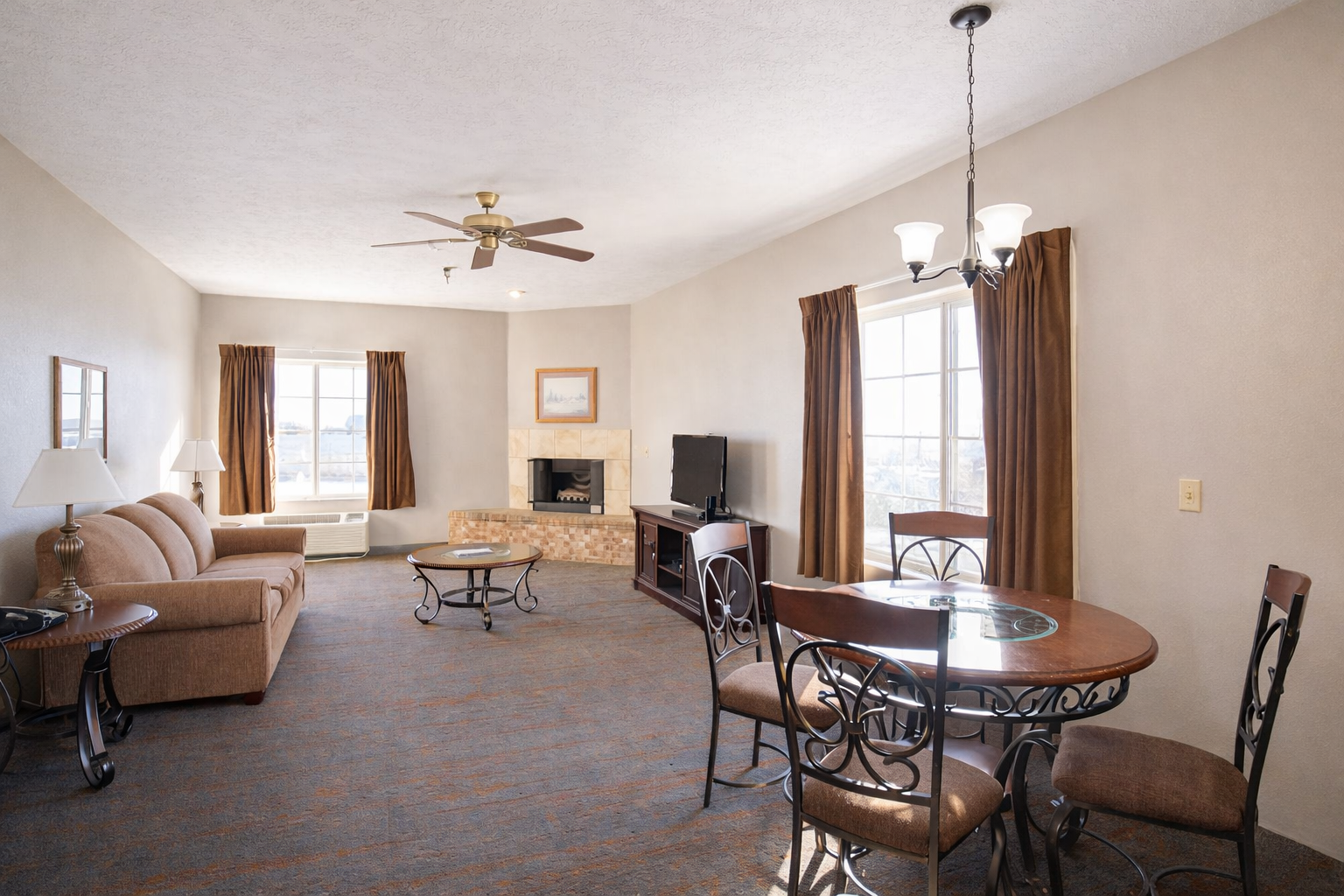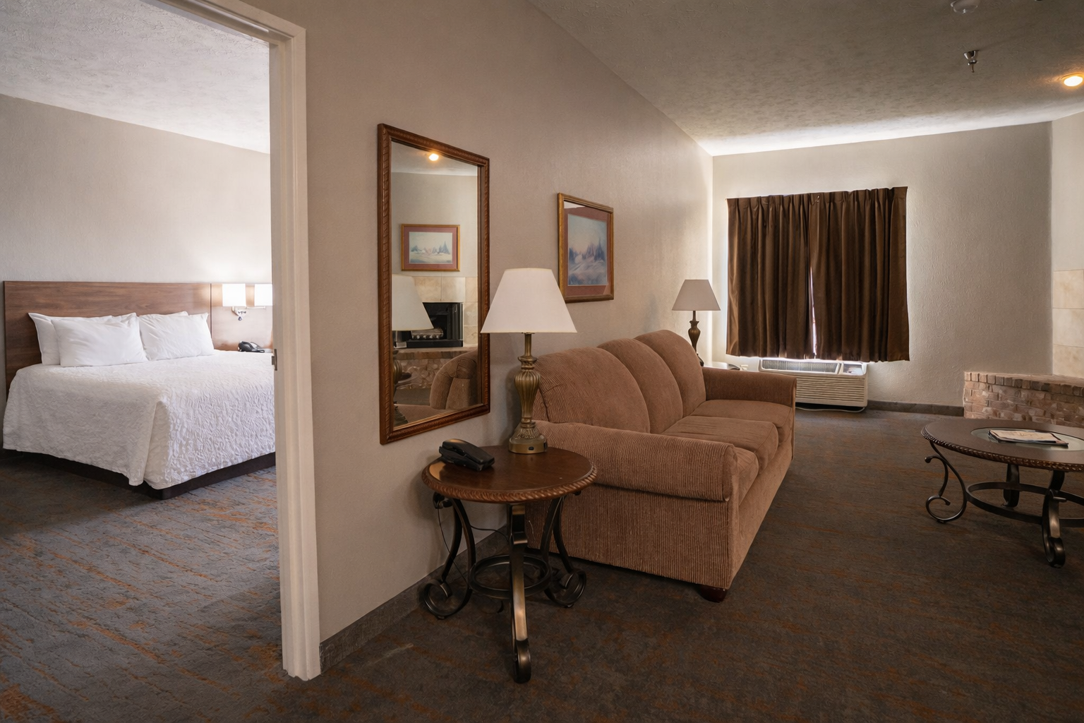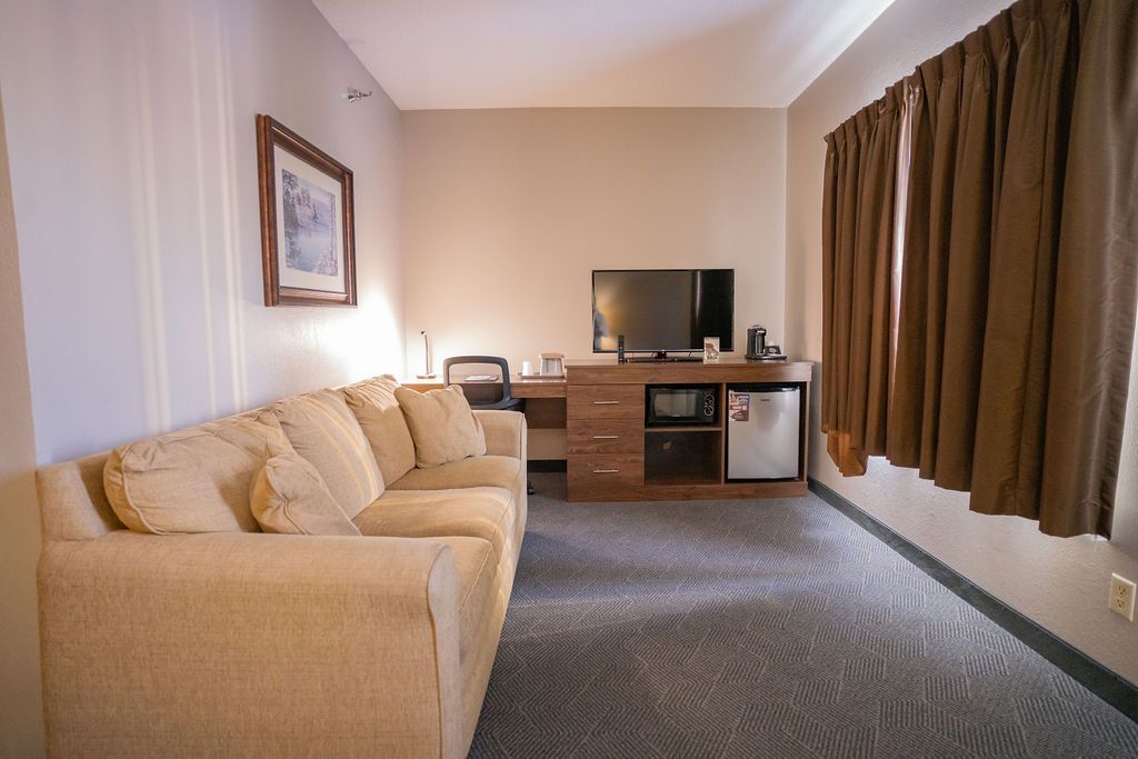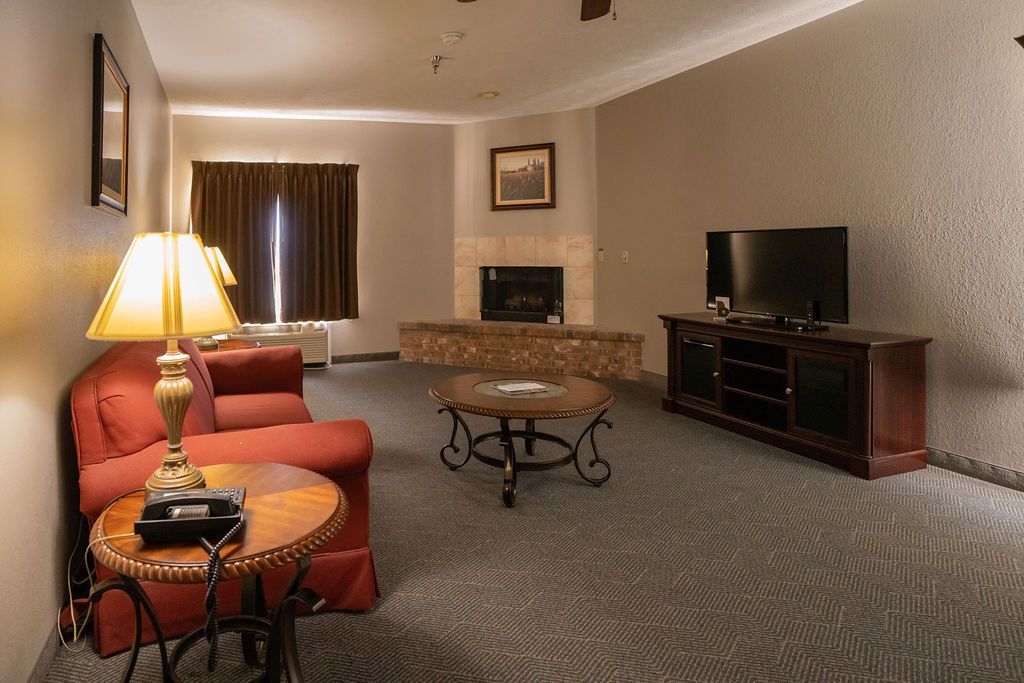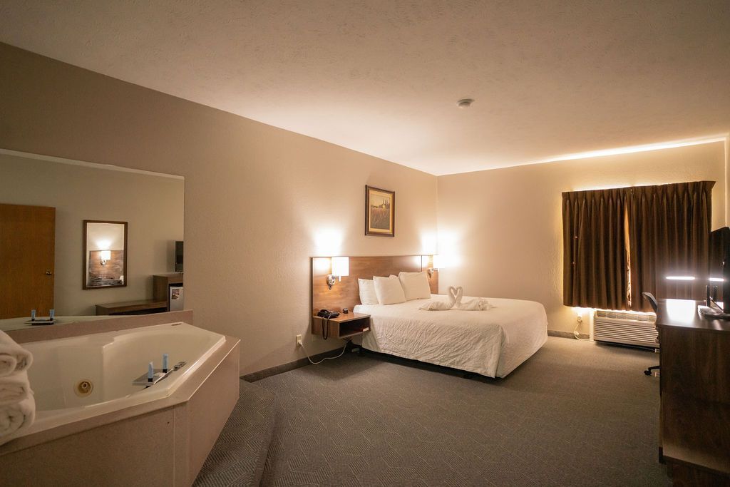 Enjoy a relaxing evening in a King Suite with a Jacuzzi Tub. This 2 room suite includes a bedroom with a King bed, a jacuzzi tub, as well as a spacious living area featuring a sleeper sofa, wet bar, free WiFi, a premium entertainment package, mini refrigerator, a spacious work desk, in-room coffee, and more. Relax the day away in cozy comfort you’re sure to enjoy.